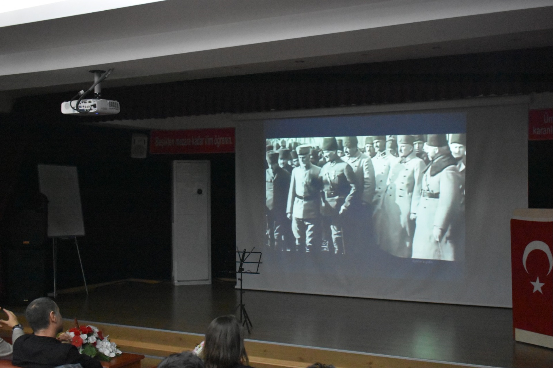Saygı Duruşu ve istiklal Marşımızın okunması ile program başladı. Açılış konuşmasını yapan Kurum Baş Öğretmeni Ramazan GÜNŞAN; “Bugün burada İstiklâlimiz, istikbâlimiz, bayrağımız, hürriyetimiz ve bizler için bir daha geri dönmemek üzere giden tarihin yazdığı şerefli kahramanları, Çanakkale Şehitlerini, bizlerin Şanlı Türk Bayrağının gölgesinde özgürce nefes alsınlar, ezanlar bu Gök kubbede yankılanmaya devam etsin diye son nefesini veren şehitlerimizi yad etmek üzere toplandığımızı, Çanakkale Zaferi'nin bir milletin diriliş destan olduğunu, bizler bilmeliyiz ki onlar, din, vatan ve bayrak uğrunda şehit olurken bizlerin omuzlarına büyük bir vebal bindiğini, bu vebali unutmamak boynumuzun borcu olduğunu” ifade etti.